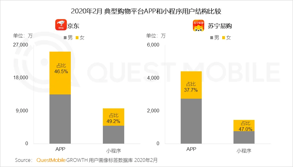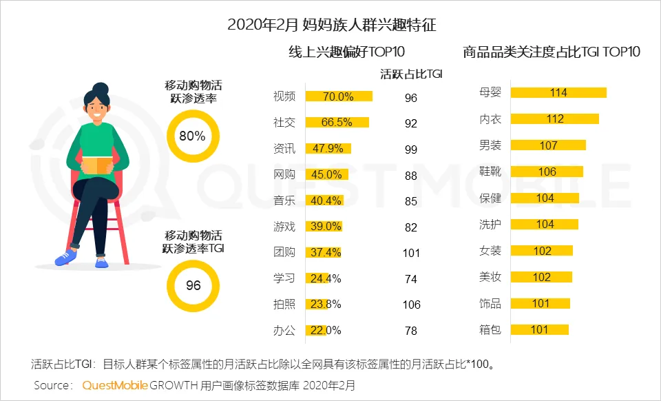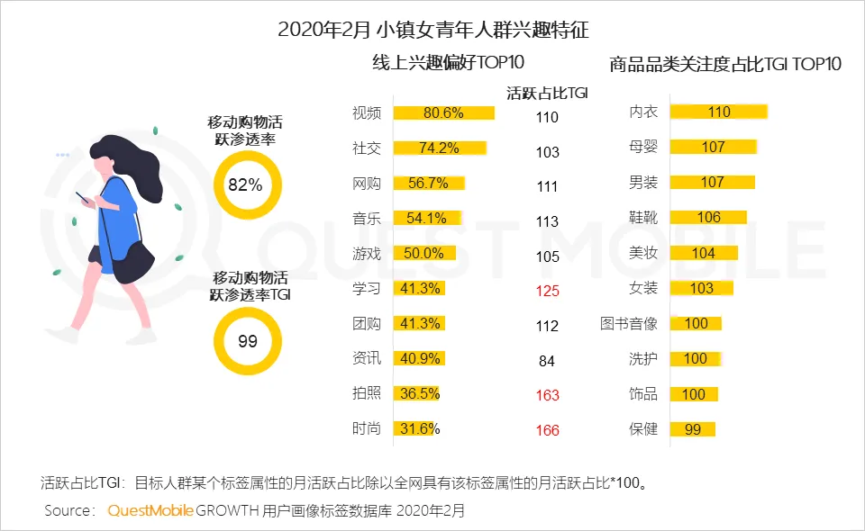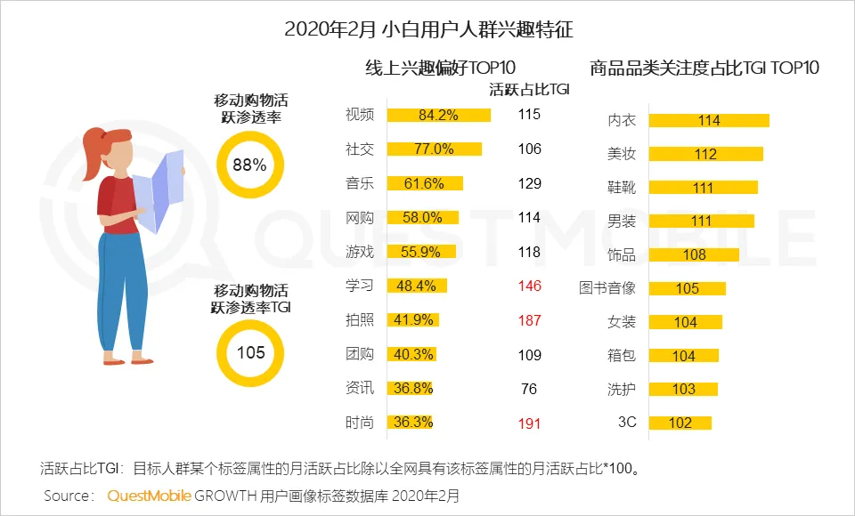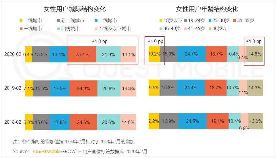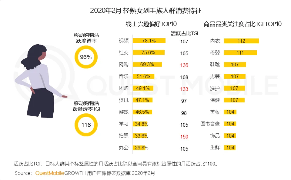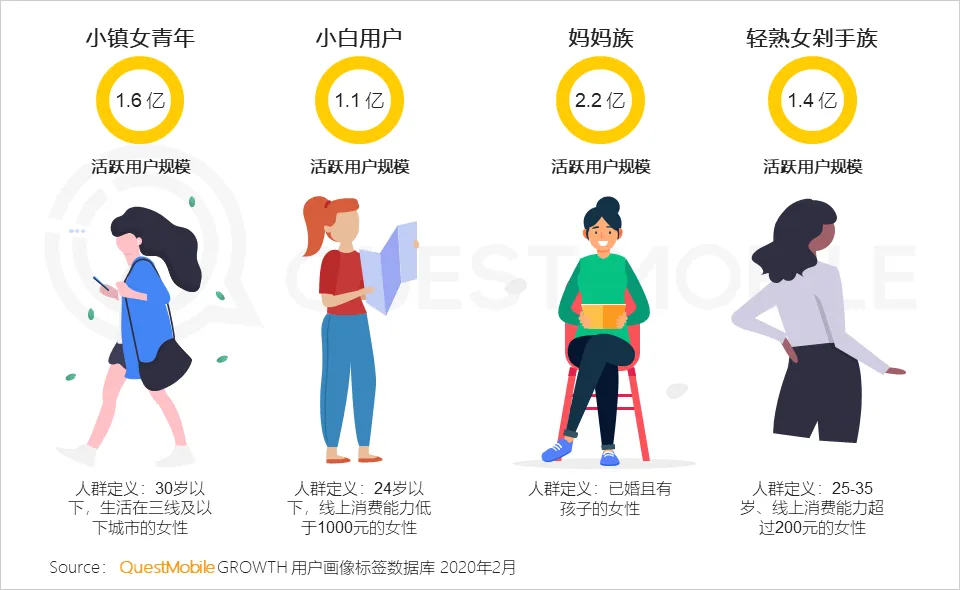 1、由于生长环境、年龄、收入等差异,不同群组的女性用户消费能力有所差异,但她们规模巨大,或出于照顾家庭需要,或出于提升自我需要,对某些品类的商品消费需求很高,值得重点挖掘。她们生活节奏较慢,有很多时间享受生活,有很一部分已经成家有孩子,需要采购家人用品,如男装和母婴用品等,消费追求性价比。多为学生或者职场新人,消费能力不高,刚开始使用电商,愿意尝鲜,对时尚敏感,购买商品多为自用,她们拥有较多的时间,乐于探索各类购物形式。年龄跨度大,她们普遍比较忙碌,用于娱乐放松的时间少,需要照顾全家,采购很多日用商品,购物精打细算。多为职场女性,收入高,线上兴趣广泛且非常活跃,网购频繁,是当前电商的优质核心用户。来源:QuestMobile