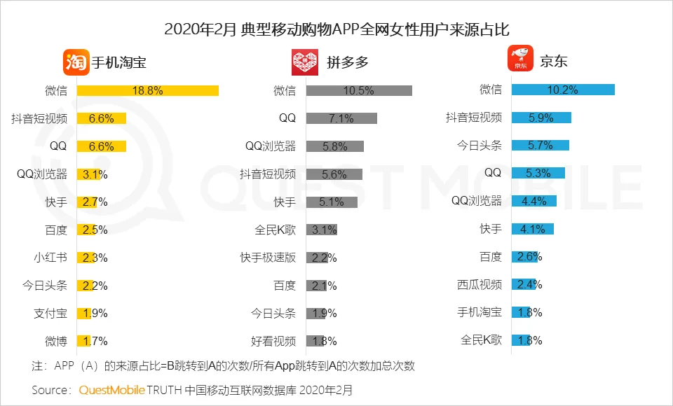 在电商领域,女性用户规模已经增长至4.46亿,同比增长8.0%,月度人均使用时长416分钟,同比增长10.3%。同时,女性用户的购买路径,也从以前的单独刷电商APP,形成了三大典型路径,分别是抖音、小红书等内容平台,微信、微博等社交平台,以及电商直播、拼团等种草玩法,从用户来源也能清晰看出这个路径差异:手机淘宝来自微信、抖音的用户分别为18.8%、6.6%,拼多多来自微信、QQ的用户分别为10.5%、7.1%。种草玩法,与KOL关系密切,例如李佳琦女性粉丝占比高达80%,线上消费能力千元以上的用户占比超过29.4%,可想而知。