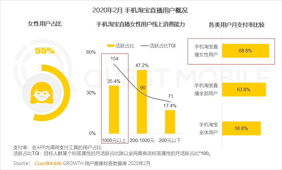 当然,直播卖货是最受女性同胞喜欢的模式:简单粗暴、转化直接高效,支付率远高于普通的用户。比如,在手机淘宝,观看直播的女性用户支付率高达68.8%,相比之下,全体手机淘宝用户的平均支付率为56.8%!那么,问题来了,如何抓住这些上帝呢?
