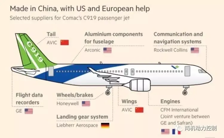 中国以外的公司提供了C919客机中的飞行控制系统、电力、照明、驾驶舱控制等等,包括最关键的航空发动机和起落架也来自海外制造商。