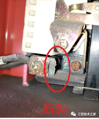 顺便说一句意外发现,在检查合闸回路时,发现合闸直流接触器的一个辅助触头接线处有严重锈蚀,用螺丝刀一拧,居然直接断了如图: