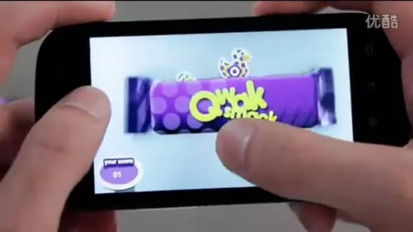用户使用这款应用对准吉百利的巧克力包装时,软件会识别包装图案并激活一个类似打地鼠的游戏,各种小怪兽从包装的边缘钻出来,可以用手指触摸“打”掉它们。