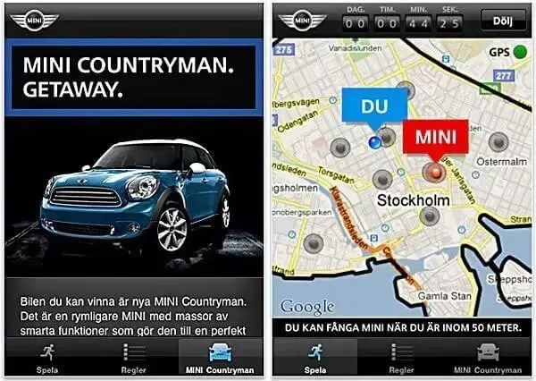 宝马曾使用AR技术,在瑞典斯德哥尔摩市某处,展示了一辆虚拟的MINI Countryman,参与者可下载活动定制APP来查看由系统控制的虚拟车的实时位置,追踪抢夺虚拟MINI。