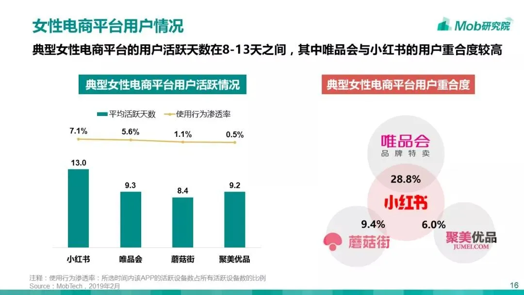典型女性电商平台的用户活跃天数在8-13天,唯品会与小红书的用户重合度较高