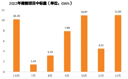 2022年储能项目中标规模达49.23GWh。22H1/Q3/Q4储能项目中标量分别为10.20/12.53/26.51GWh。22年风光发电的强制配储加上并网截止时间临近催生2022年底国内地面光伏项目抢装,是2022年下半年国内储能项目中标量持续增长的主要原因。