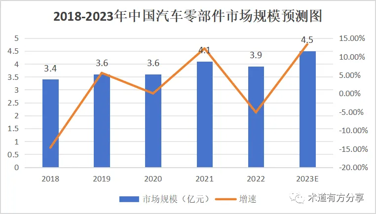 汽车零部件生产制造作为产业链的中游,是汽车产业链的中流砥柱,也是最核心的一部分,其中汽车零部件产值约占整车产值的50%-70%。随着中国汽车行业的高速发展、汽车保有量的增加,我国汽车零部件行业得到了迅速发展,增长速度整体高于我国整车行业。2022年我国汽车零部件市场规模将已经达到3.8万亿元。预计2023年市场规模将达到4.5万亿元。