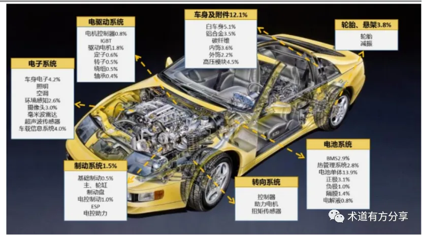 2023 年初至今,汽零板块冲高后震荡下行,后开始逐步修复,到目前为止已经在逐渐复苏了。从行业细分来看,零部件细分领域比较广。传统的汽车零部件包含发动机系统、传动系统、制动系统、转向系统、汽车电子、底盘系统、内外饰等,新能源汽车则不含发动机和变速箱,增加驱动电机、电机控制器、动力电池系统等核心零部件,根据钜大锂电数据,三电系统(电池、电机、电控)在新能源汽车成本中约占50%。