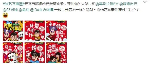 #综艺万事屋#元宵节腾讯综艺谜题来袭,开动你的大脑,和@喜马拉雅FM @滴滴出行@58同城 @美拍 @IDo官方微博一起,开启不一样的精彩~看综艺元素你猜对了几个?