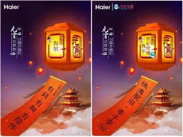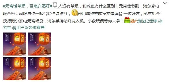 节日营销中品牌联合是一种常见形式,除了腾讯视频和滴滴出行等的联合灯谜,海尔家电也联合世纪佳缘、苏宁和土巴兔装修家居发布了#元宵话梦想,召唤许愿灯#的活动。