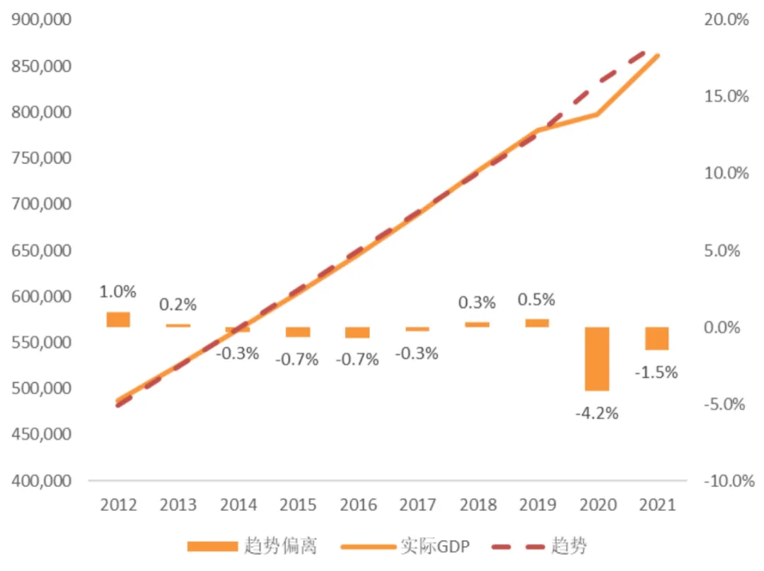 国内消费和投资显著低于趋势值的原因不仅是疫情防控的影响,也包括了政策支持的过早退出,难以支持合理的内需增长,以及某些时间段内的供给冲击。