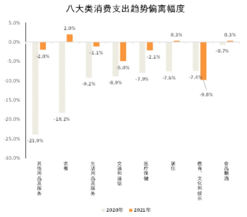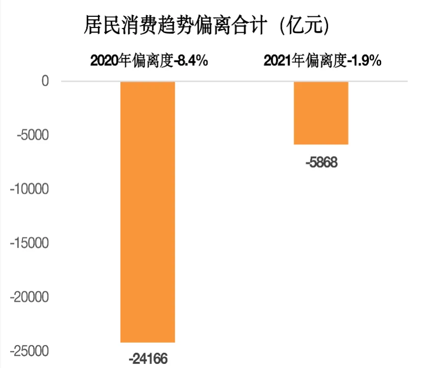 2020年,经过价格调整后的实际消费低于其趋势值8.4个百分点,约2.42万亿人民币;2021年,经过价格调整后的实际消费低于其趋势值1.9个百分点,约0.59万亿人民币。从消费构成情况来看,2020年八大类消费无一例外地低于趋势值。