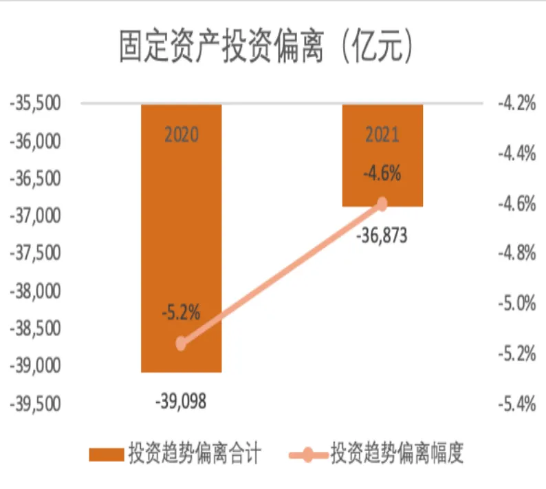 固定资产投资增速显著低于趋势值。全社会固定资产投资显著低于其趋势值,2020年全社会固定资产投资偏离其趋势值3.9万亿人民币,偏离度-5.2%;2021年偏离其趋势值3.7万亿人民币,偏离度-4.6%。从固定资产投资构成情况来看,制造业和房地产投资2021年已经回到了趋势值,制造业投资高出趋势值2.4%;服务业投资(2021年偏离度-9.5%)和基础设施建设投资(2021年偏离度-15.8%)大幅低于趋势值。