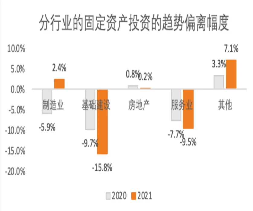 固定资产投资的新变化大大偏离了过去持续多年的结构变化轨迹。2012年以来,在经济结构从制造到服务转型的背景下,制造业投资占比持续下滑,基础设施投资和服务业投资占比上升,这是顺应产业升级和消费升级的投资结构变化轨迹。2021年的投资结构变化明显偏离了这个轨迹。