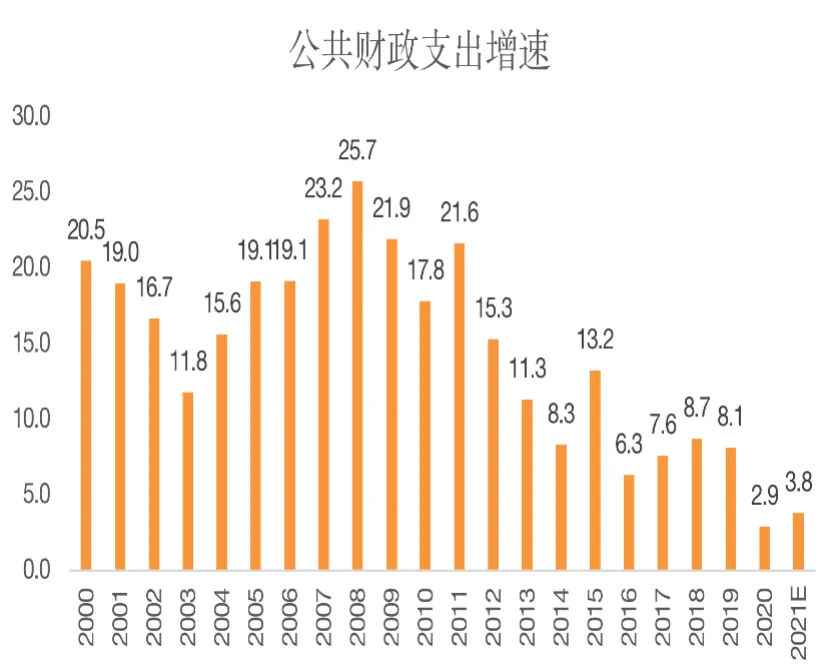 财政政策方面,2020年疫情爆发以后财政收入受到显著影响,宏观经济管理当局通过多种渠道筹措资金扩大财政支出,支持需求增长,2020年财政支出增速2.8%;进入2021年以后,财政收入大幅回升,财政支出增速仍保持在低位,基于1-11月的数据估计2021年增速3.8%。2020-2021年期间的财政支出增速大幅低于此前10年大约12%的财政支出增速。