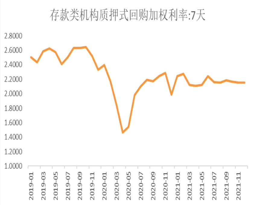 货币政策方面,2020年疫情爆发以后央行一度引导市场利率大幅下行,存款类机构7天质押回购利率曾一度下行到2020年4月的1.46%月均值,此后该利率迅速回升,进入2020年8月以后回升到2.19%的月均值,此后至2021年年末多数时间维持在2.1-2.2%区间波动。