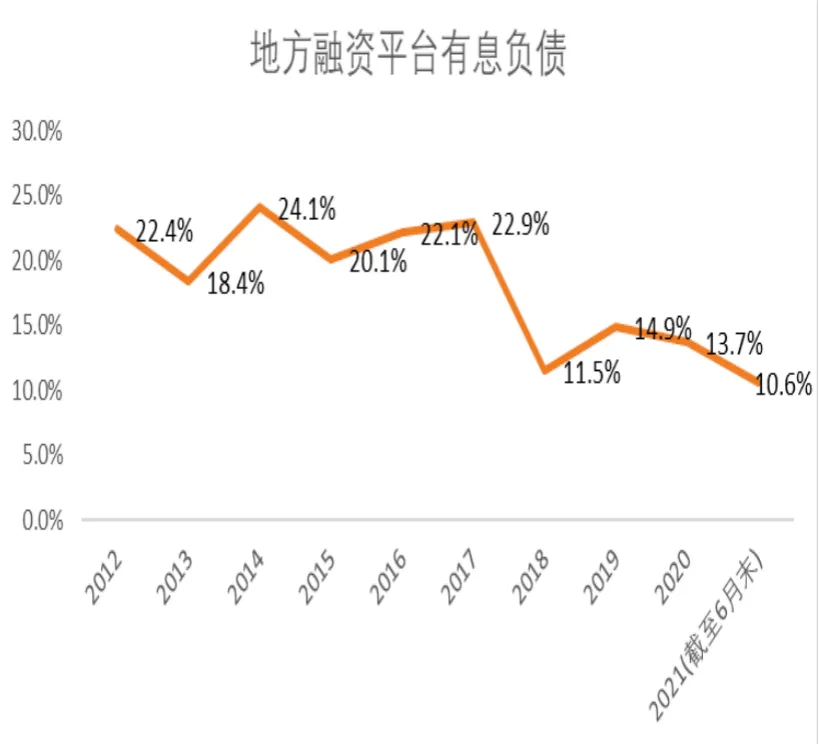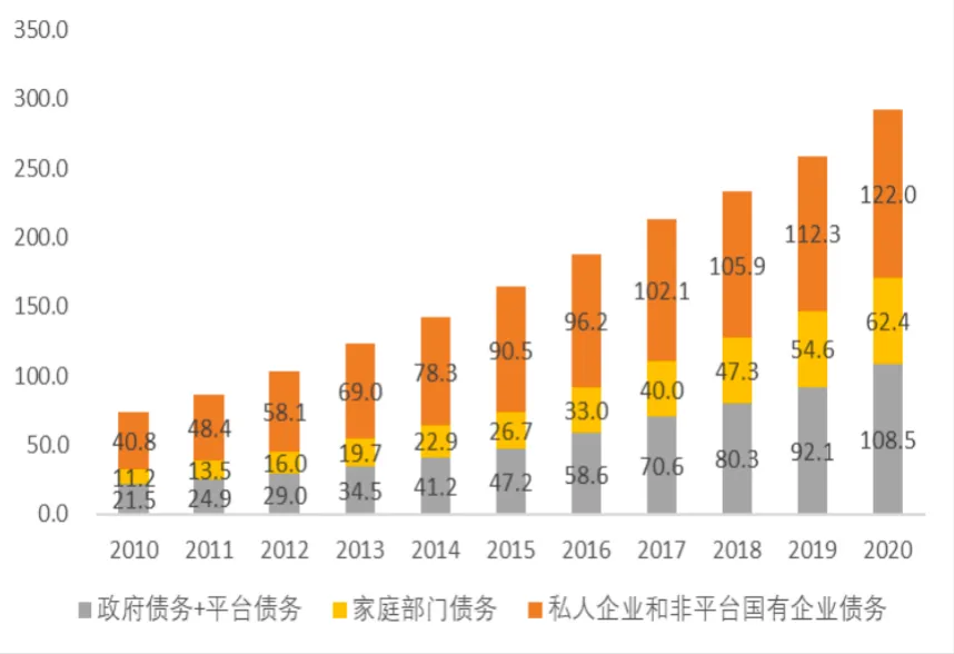 进入二十一世纪的第二个十年,中国经济全面进入从工业到服务业的经济结构转型,上述资本密集型行业产品普遍面临供大于求的局面,企业新增信贷需求大幅下降。2020年与2010年相比,广义信贷增长的构成也发生了显著变化,私人企业和非平台国有企业信贷增长在广义信贷增长中的占比从56.9%下降到25.9%。家庭部门以住房抵押贷款为主体的信贷增长在一定程度上对冲了企业新增信贷需求的下降,但远不足以保持与供给方扩张相对应的信贷(购买力)扩张,政府债务增长和地方政府融资平台债务增长成为广义信贷增长的重要支柱。政府和地方政府平台主导的信贷增长在广义信贷增长中的占比从25.9%上升到49.6%,家庭部门从17%上升到34%。