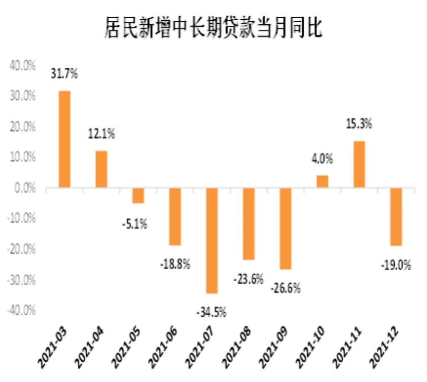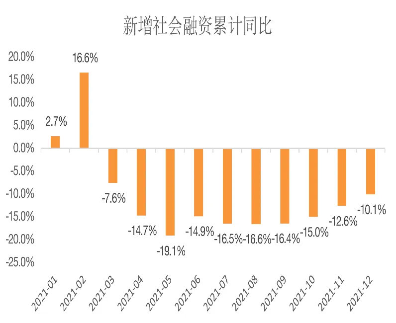 财政和货币政策难以对总需求扩张形成支持,针对地方融资平台的隐性债务风险治理和更加严格的房地产相关信贷政策进一步紧缩了信用扩张。2021年全年新增社融31.3万亿,较去年下降10%。新增社融的下降会带来社会新增购买力的下降,这是当前国内需求相对低迷的主要原因。