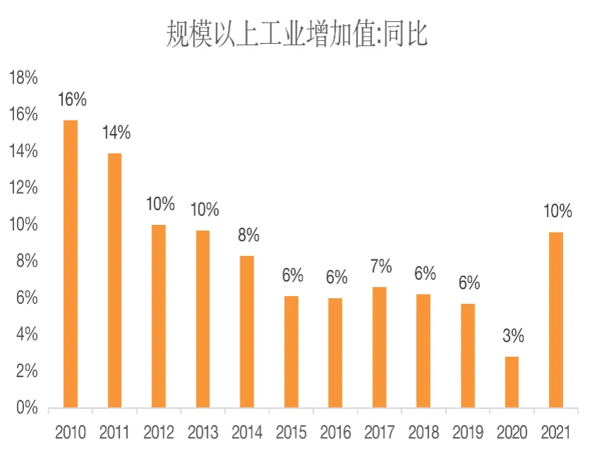 暂时性的煤炭短缺,双控政策、以芯片为代表的供应链短缺和原材料价格上涨等因素对2021年的宏观经济运行也带来了负面影响,但总体而言这些来自供给端的负面冲击很快得到修正,整体而言对宏观经济的影响也相对有限。具体表现为这些冲击更多影响工业品部门,2021年工业部门增加值累计增速10%, 这是过去五年中表现相对较好的年份。