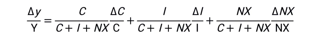 支出法计算国内生产总值,GDP等于最终消费支出、资本形成总额与货物和服务净出口之和。对等式两边同时求导,给定2022年GDP增速目标,再结合历史数据估算相关参数就可以求出消费、投资与净出口“三驾马车”的目标增速。这里用Y表示GDP,用C/I/NX分别表示消费、投资与净出口,那么用支出法计算国内生产总值可以表示为: