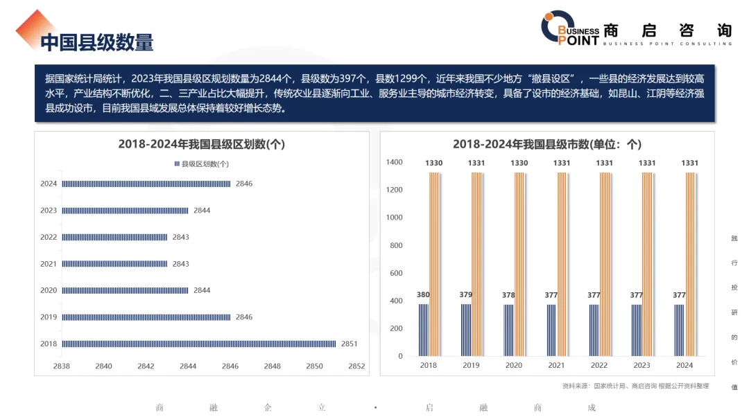据国家统计局统计,2023年我国县级区规划数量为2844个,县级数为397个,县数1299个,近年来我国不少地方“撤县设区”,一些县的经济发展达到较高水平,产业结构不断优化,二、三产业占比大幅提升,传统农业县逐渐向工业、服务业主导的城市经济转变,具备了设市的经济基础,如昆山、江阴等经济强县成功设市,目前我国县域发展总体保持着较好增长态势。