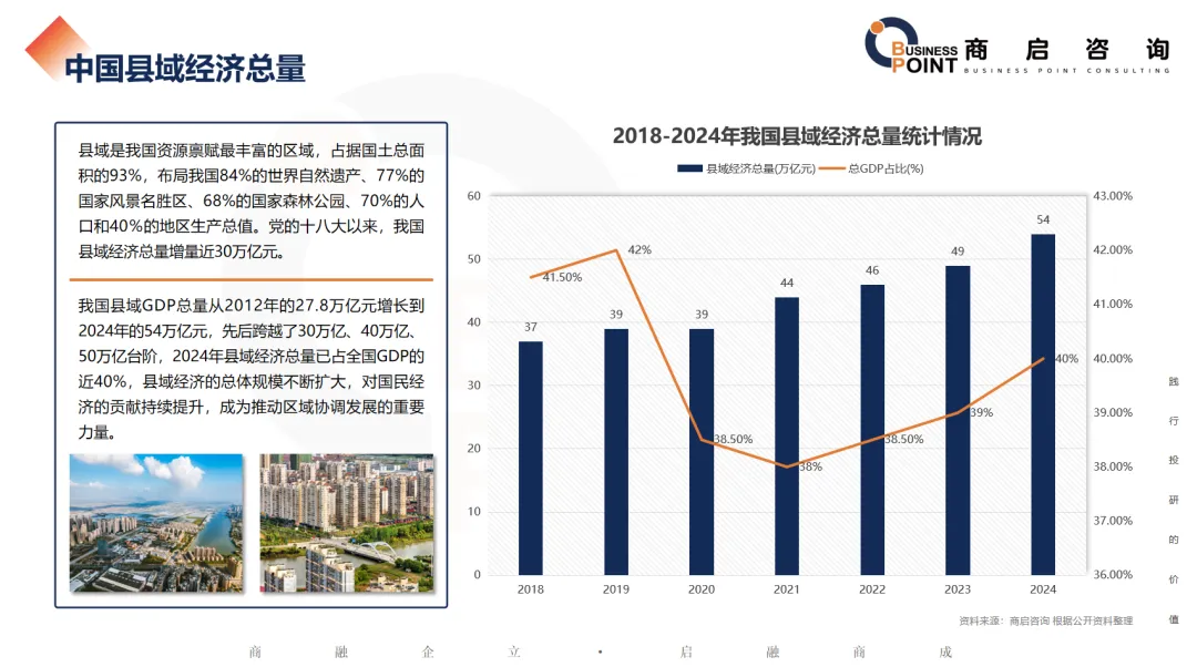 县域是我国资源禀赋最丰富的区域,占据国土总面积的93%,布局我国84%的世界自然遗产、77%的国家风景名胜区、68%的国家森林公园、70%的人口和40%的地区生产总值。党的十八大以来,我国县域经济总量增量近30万亿元。