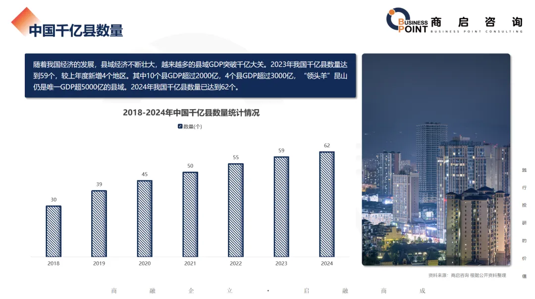随着我国经济的发展,县域经济不断壮大,越来越多的县域GDP突破千亿大关。2023年我国千亿县数量达到59个,较上年度新增4个地区。其中10个县GDP超过2000亿,4个县GDP超过3000亿,“领头羊”昆山仍是唯一GDP超5000亿的县域。2024年我国千亿县数量已达到62个。