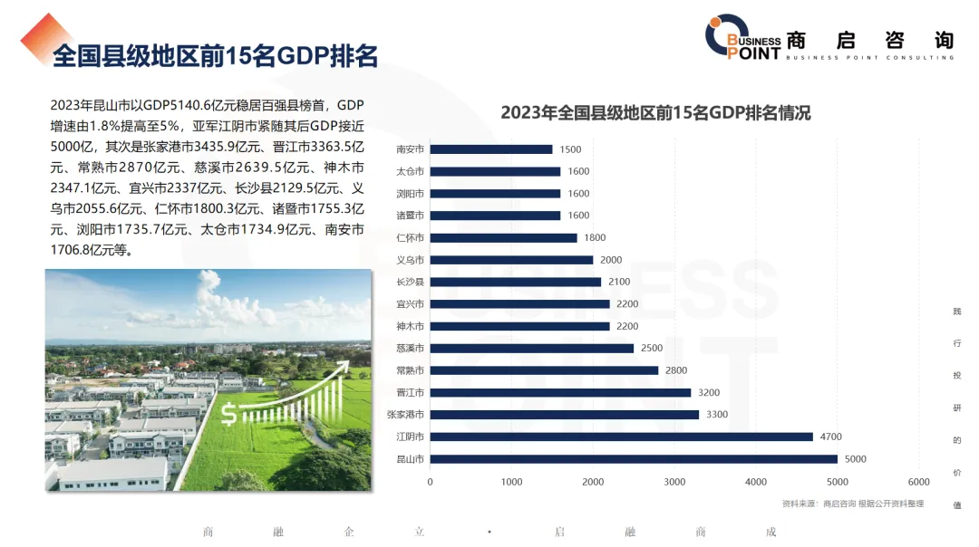 2023年昆山市以GDP5140.6亿元稳居百强县榜首,GDP增速由1.8%提高至5%,亚军江阴市紧随其后GDP接近5000亿,其次是张家港市3435.9亿元、晋江市3363.5亿元、常熟市2870亿元、慈溪市2639.5亿元、神木市 2347.1亿元、宜兴市2337亿元、长沙县2129.5亿元、义乌市2055.6亿元、仁怀市1800.3亿元、诸暨市1755.3亿元、浏阳市1735.7亿元、太仓市1734.9亿元、南安市1706.8亿元等。