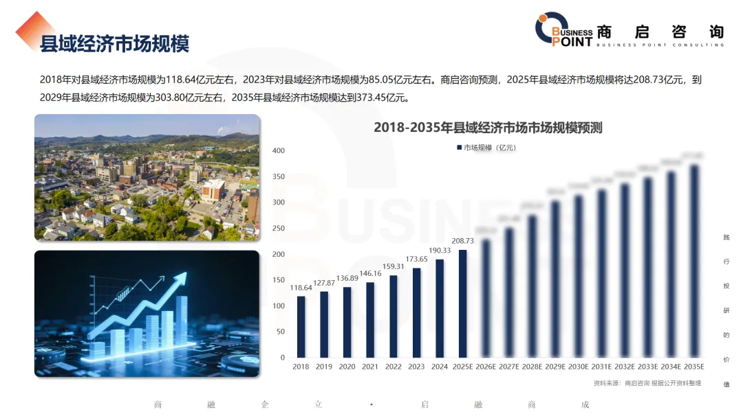 2018年对县域经济市场规模为118.64亿元左右,2023年对县域经济市场规模为85.05亿元左右。商启咨询预测,2025年县域经济市场规模将达208.73亿元,到2029年县域经济市场规模为303.80亿元左右,2035年县域经济市场规模达到373.45亿元。