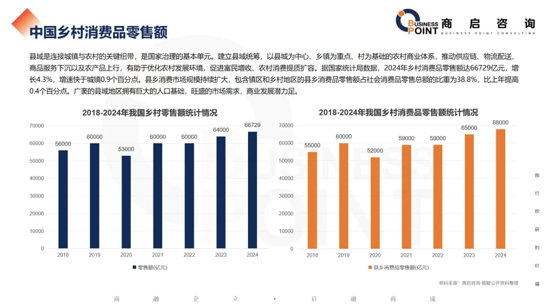 县域是连接城镇与农村的关键纽带,是国家治理的基本单元。建立县域统筹,以县城为中心、乡镇为重点、村为基础的农村商业体系,推动供应链、物流配送、商品服务下沉以及农产品上行,有助于优化农村发展环境,促进富民增收、农村消费提质扩容。据国家统计局数据,2024年乡村消费品零售额达66729亿元,增长4.3%,增速快于城镇0.9个百分点。县乡消费市场规模持续扩大,包含镇区和乡村地区的县乡消费品零售额占社会消费品零售总额的比重为38.8%,比上年提高0.4个百分点。广袤的县域地区拥有巨大的人口基础,旺盛的市场需求,商业发展潜力足。