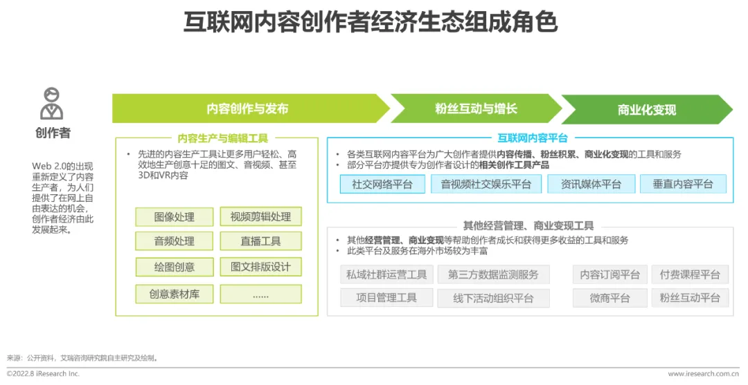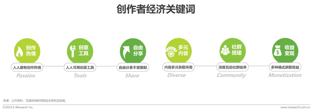 创作者经济可以理解为热情经济的子集,更加聚焦于互联网平台内容,指互联网内容创作者在创作工具、内容分发平台及一系列其他创作者相关服务的帮助下产生经济收益。