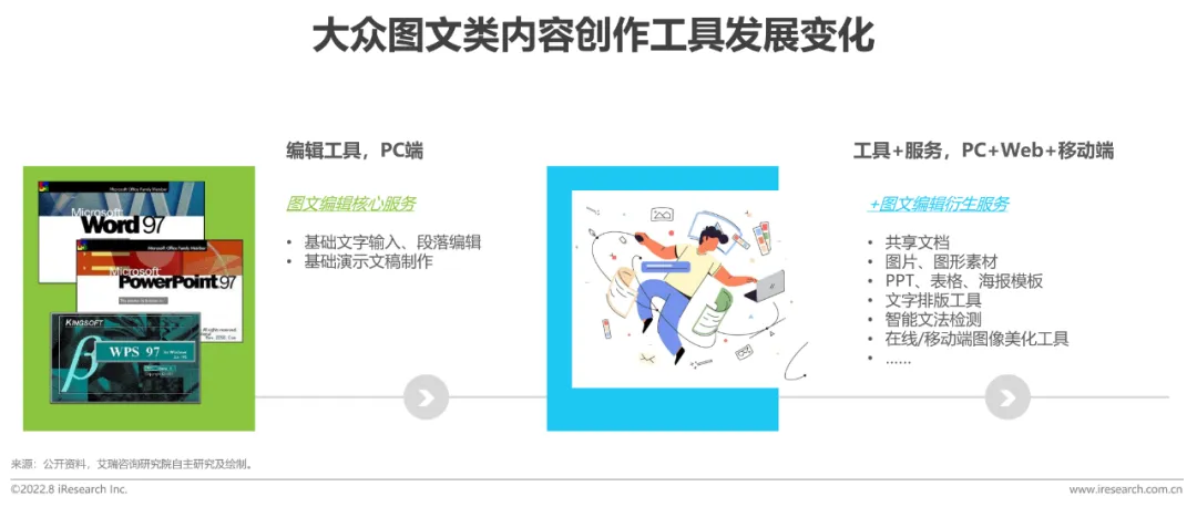 随着用户创作需求的增长,用户已不单单满足于工具的使用,同时对文档、PPT、海报的模板和创意素材资源及其他相关服务的需求也不断增加,催生出一批提供相关专业服务的平台。