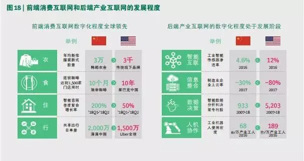 报告首次分别将中外前端消费互联网和后端产业互联网的发展进行全面对比,指出中国特色的数字化路径:前端消费互联网带动后端产业互联网的发展。