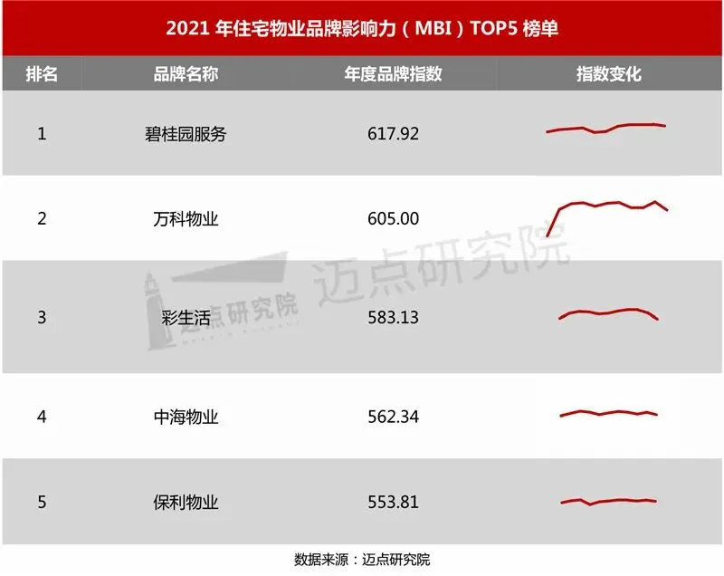 物业品牌榜单数据来源于迈点品牌指数MBI,根据2021年迈点品牌指数MBI物业品牌类目1000余家品牌数据汇总统计而成。具体说明:迈点品牌指数MBI(物业)主要从搜索指数、运营指数、媒体指数3个维度分析品牌在互联网和移动互联网的影响力。注:MBI,指某品牌的迈点品牌指数数据;a、b、c,指系统中的加权系数;SI(search Index),指搜索指数;OI(Operation Index),指运营指数;MI(Media Index),指媒体指数。注意:企业或个人可参照品牌指数数据对品牌发展进行监测和预测,但迈点品牌指数MBI不能与其品牌发展完全等同。搜索指数:一段时期内, 品牌关键词在主流搜索引擎中正面搜索频次的加权和运营指数:一段时期内, 品牌在互联网和移动互联网的运营情况, 如微博、 微信等。媒体指数:一段时期内, 大众媒体和行业媒体报道中与品牌关键词相关的正面新闻数量。