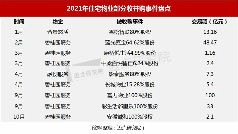 2021年,碧桂园服务实现收入288.43亿元,位居国内以物业服务为主营业务的同类公司首位,表现亮眼。2021年,在坚持“大物业管理”和“大社区服务”的业务组合战略下,碧桂园服务保持高质量增长,在第三方品牌外拓、社区增值服务、城市服务、“三供一业”等方面均实现突破。预计未来将通过包括合作、收并购、自身发展等方式打开更大的发展空间。3、收并购:住宅物业收并购进一步增加,行业竞争白热化2021年堪称物业的“并购大年”,收购动作以包含住宅物业的综合性物业公司为主。回顾年度住宅物业的大额并购动作,大型物企通过股权收购有利于实现企业之间的优势互补。如碧桂园服务在安徽首次收购本土物业企业,有利于拓展安徽物业市场。合景悠活、融创物业也在积极收购优质资产,拓展新区域,进一步推动了物企规模的快速增长,行业竞争走向白热化。
