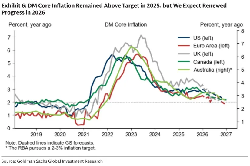尽管2025年发达经济体的核心通胀率仍高于目标水平,但高盛预计2026年通胀将有所改善。这一预测基于全球经济活动的放缓以及货币政策的调整。图表显示了美国、欧元区、英国、加拿大和澳大利亚的核心通胀率变化,以及对未来几年的预测,突出了通胀控制的复杂性和不确定性。