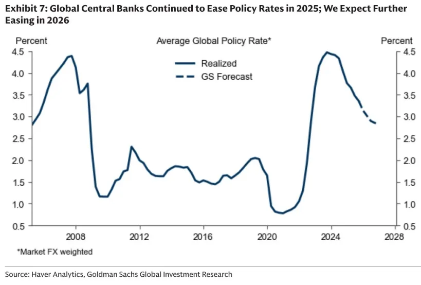 Exhibit 7:全球央行在2025年继续放松政策利率;我们预计2026年将进一步放松
