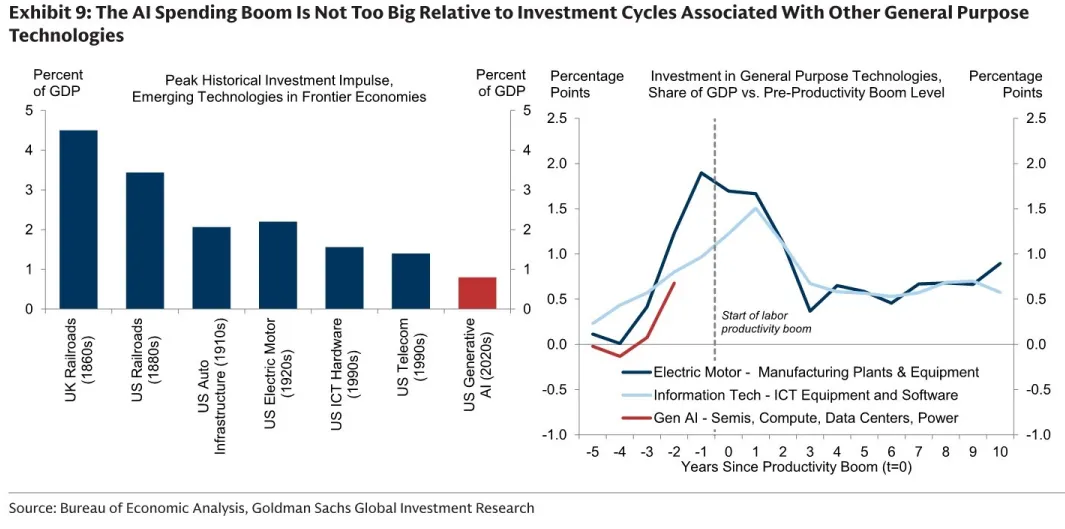 Exhibit 9:AI支出热潮相对于其他通用技术的投资周期并不算大
