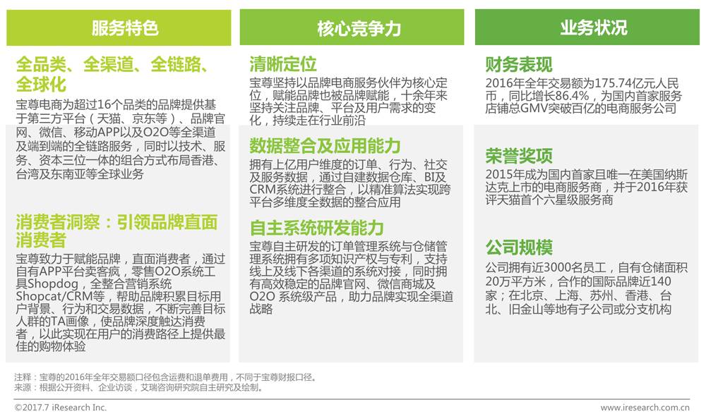 作为国内一流的品牌电商服务伙伴,宝尊电商为时尚服饰、科技生活、家居出行等8大行业提供端到端的一站式电商服务,包括零售运营、技术与系统开发、仓储物流、客户服务、商品管理、数字营销和策略咨询等,十余年来坚持在产业价值链上进行全方位的规划与布局,持续为品牌商创造价值的同时助力品牌商在电商领域获得成功。宝尊自2007年成立以来不断拓展营销渠道,整合线上线下的消费者数据,增强与消费者的互动,2016年宝尊成为首家天猫六星级服务商。宝尊在2016年成立宝通易捷全资独立子公司孵化仓储物流业务后,将继续在技术服务、数字营销、策略规划、大数据应用、人工智能等板块加大投资,力图发展前瞻性技术与优化资源配置,以精益化、品质化、个性化的电商服务打造自身发展新优势。
