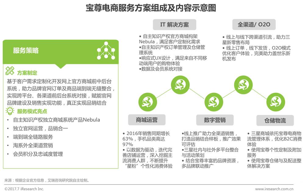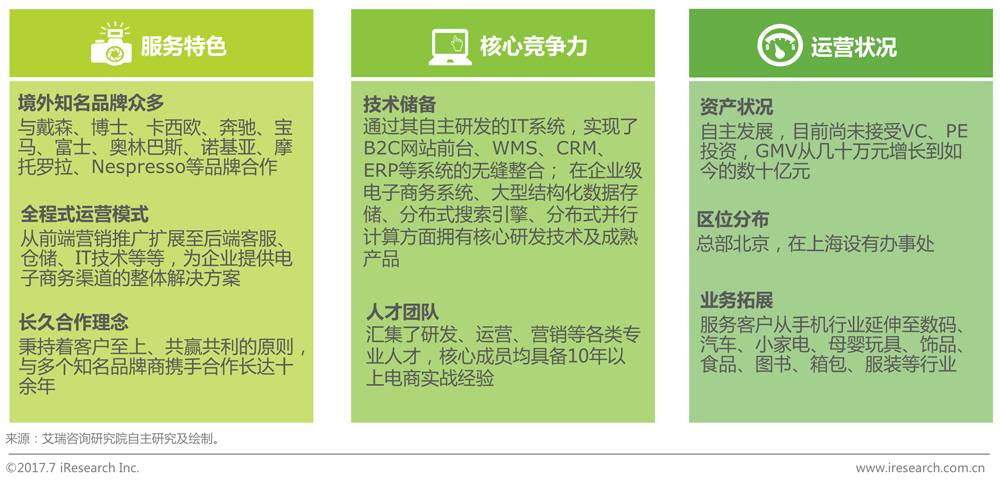 本报告中,定性部分的品牌电商服务是指在电子商务活动中服务商为品牌商提供的部分或全部电子商务服务,包括IT软件服务(如ERP、CRM系统,商品管理工具等)、营销服务、运营服务(如代运营)、仓储物流服务以及客户服务等。品牌电商服务行业属于服务输出型行业,得益于电子商务的快速发展的背景下品牌商拓展电商业务的刚性需求。