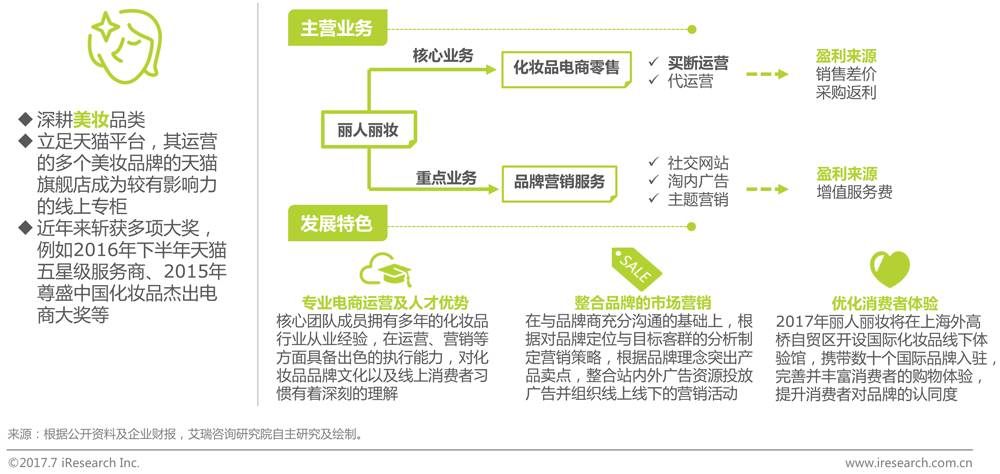 作为一家专业的美妆品牌电商服务商及线上零售商,丽人丽妆的竞争优势主要表现在以下几个方面:(1)保证正品授权:丽人丽妆与品牌方达成合作协议,以线上专柜模式销售品牌化妆品,为消费者提供优质化妆品的正品资源;(2)深耕美妆领域:丽人丽妆从2010年成立之时起始终专注于美妆品类,拥有超过50个美妆品牌授权,是天猫美妆平台中开设品牌旗舰店数量最多的网络零售服务商之一;(3)注重品牌价值建设:丽人丽妆在致力于销售额增长的同时,从营销策划、宣传设计、技术支持等各个领域助力品牌影响力增长;(4)出色的数据分析能力:丽人丽妆积累了庞大的用户消费数据,通过产品的点击量、客单价及转化率等指标敏锐洞察消费者偏好,优化产品组合与定价策略,协助品牌商进行新品开发。