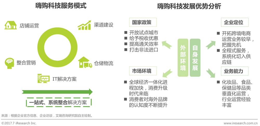 出于国家政策和市场环境的外部利好,众多国外品牌商瞄准中国市场的巨大潜力,跨境进口零售电商成为新一轮的经济风口。基于对宏观经济局势的敏锐洞察,嗨购科技及时把握产业细分机会,一举突破国外品牌线上扩张痛点,成为第一批专注于跨境电商服务的企业,并在2015年登陆新三板,成为跨境电商服务商第一股。迄今,嗨购科技已服务超过20个国际知名品牌,在澳新地区以及保健品、食品、化妆品等品类具有领先优势。其运营的ChemistWarehouse在2016年双十一购物节中销售额破亿,嗨购科技因此成为跨境进口零售电商历史上首家日销量破亿的服务商;嗨购科技连续两年被评为天猫国际五星级服务商,2016年荣获“思路∙杰出新零售运营服务商”称号。作为国内领先的跨境电商服务商,嗨购科技致力于为全球品牌提供中国电商整体解决方案,拥有广阔的市场前景和良好的发展空间。