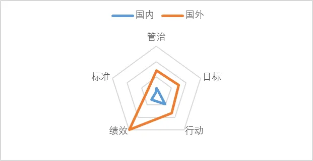 下图为国内外水泥企业的碳排放情况在管治、目标、行动、绩效、标准5个维度方面的平均得分图。可以看出,国外头部企业各指标的披露情况都优于国内平均水平;国内行动方面的披露情况较为良好,而国外企业各方面披露的都较为充分和平衡,但在绩效方面披露的最完善。