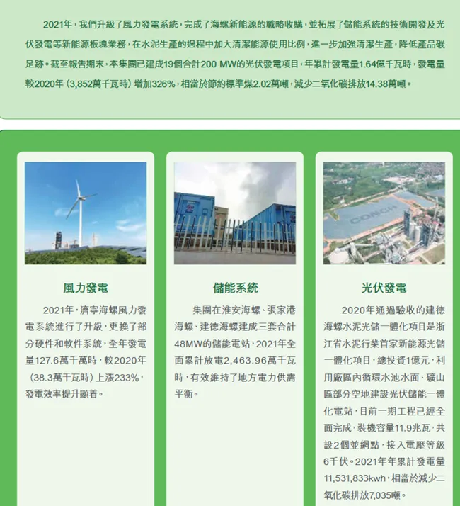 相较于其他指标的披露,我国水泥公司在3.2指标的披露方面表现较为良好。有14家公司在该指标方面得到了10分,9家公司得到了5分,只有4家未披露该指标相关信息。下图是海螺水泥的部分减碳行动信息披露(来自2021年海螺水泥企业社会责任报告)。关于这部分更详细的信息可以查阅青悦发布的从国内外8家水泥头部公司看低碳转型路径。