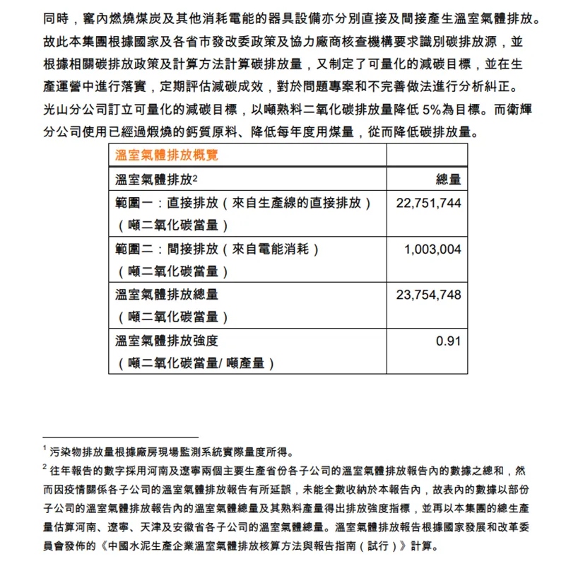 在4.1指标的披露方面,东吴水泥(股票代码:00695)、海螺水泥(股票代码:600585,00914)、华润水泥(股票代码:01313)、华新水泥(股票代码:600801)、亚洲水泥(股票代码:00743)、中国建材(股票代码:03323)等9家水泥公司在该指标方面得到了10分,有18家未提供任何碳排放数据信息。以东吴水泥(股票代码:00695)的披露信息为例: