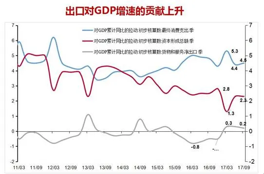 中国经济今年之所以能见底回稳,三驾马车之一的出口对经济回稳起了至关重要的作用。单纯从净出口来看,其对GDP的贡献今年为0.2个百分点,而去年是-0.4,如果没有这个负值的影响,中国去年GDP增长应该是7.1%,会比今年高。这就解释了全球经济回暖对中国经济起到的重要作用,当然,中国经济主要还是靠投资拉动。