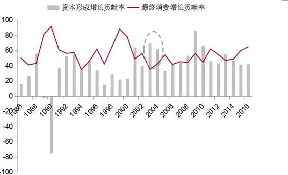 另外,消费增长贡献率比重也很大,占了60%多。很多人误以为中国已转变为消费拉动经济的增长模式,实际并非如此,只是投资对经济增长拉动的效率在下降(如上图所示)。