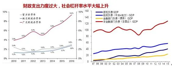 中国民间投资增速有过三次高潮,但增速均逐级向下。第一次是亚洲金融危机期间,朱镕基总理号召修建各地高速公路,民间投资积极跟进,上海也出现了不少民间的“公路大王”;第二次是受美国次贷危机的影响,温家宝总理推出“两年四万亿”计划,虽然民间投资出现反弹,但遗憾的是力度比较小。制造业投资回报率下降,资金就流向房地产和金融领域;第三次是2016年房地产加上基建投资突飞猛进,但民间投资增速反弹乏力。2015年下半年以来,房地产价格出现快速上涨的现象,去年主要是在一二线城市,今年在三四五线城市。随着三四线城市开发土地面积的大幅增加,钢筋和水泥等的需求量也大幅增长。钢铁、水泥价格上行,并不意味着“新周期”来临。总体来说,2016年这一轮拉动经济增长的力度非常大,但是效果要弱一些。如果把发债、PPP和政府性产业资金等都看作财政支出,广义财政的赤字率就达到了9.4%;按照财政部的口径,财政赤字率是3%,还在安全线以下。由于债务率和杠杆的上升,中央提出要去杠杆,“十九大”报告中也提出要提高财税改革的质量。