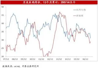 我做了一个行业表现分档表,将每个月各行业的表现均分为五档,涨幅最高的一档得5分,涨幅最低的一档得1分,因此,12个月累计最高分是60,最低分是12。按此标准评分下来,一年中得分最高的生物医药行业只有37.6分,得分最低的新能源行业为32分,差别并不大。各行业总体集中在中位数这个位置,这说明一年中某个行业要大幅度跑赢市场很难,投资的行业选择从短期来说差别不大。