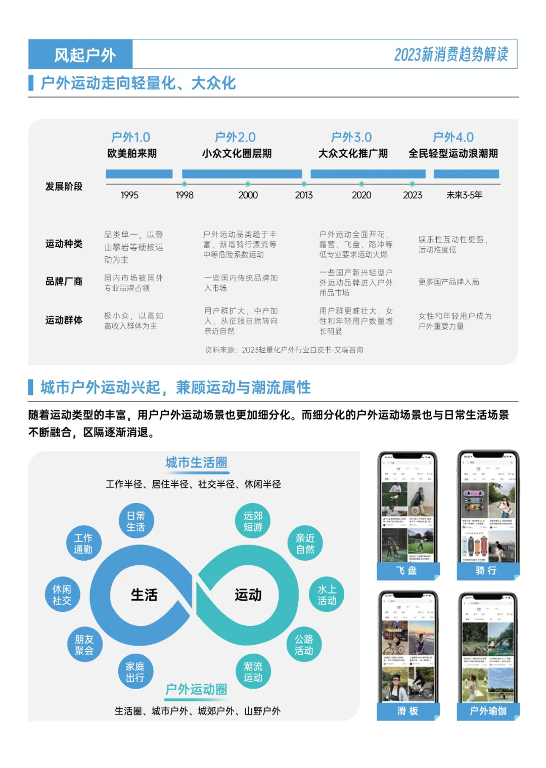 城市户外兼具运动与潮流属性,近半年兴起的飞盘、骑行、滑板、户外瑜伽就是其中的代表,细分化的户外运动场景与日常生活场景不断融合,区隔逐渐消退。