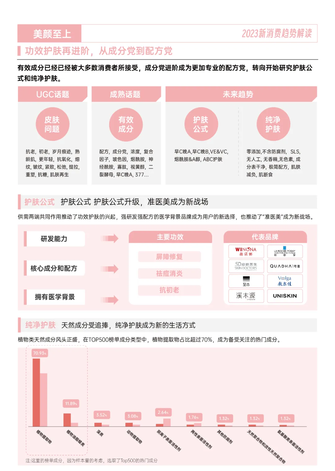· 护肤理念:功效护肤再进阶,从成分党到配方党,护肤公式升级,准医美将成为新战场,天然成分受追捧,极简纯净护肤成为新的生活方式。